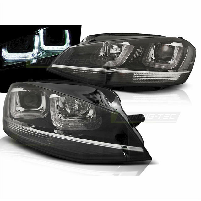 Die neuen LED U Scheinwerfer passend für den VW Golf 7 kommen im inklusive echtes Tagfahrlicht. Die schwarzen Scheinwerfer sind ausgestattet mit den Grundfunktionen der originalen Scheinwerfer. Die Leuchtweitenregulierung ist in diesem Set bereits integriert. Es müssen keine Stellmotoren umgebaut werden. Xenon Optik Linse mit H7 Leuchtmittel, integrierte Blinker, LED Tagfahrlicht und LED Standlicht in gedimmter Funktion.