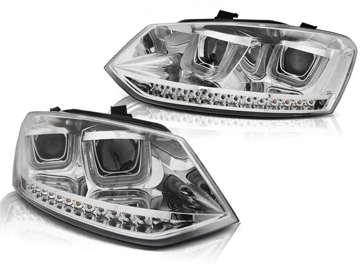 Diese LED Scheinwerfer in Chrom verleihen Deinem VW Polo 6R von 2009 bis 03/2014 ein unverwechselbares Upgrade. Mit ihrer markanten Lichtsignatur, der modernen U-Form des LED Standlichts und den sequentiellen Blinkern bringst Du mehr Stil und Sicherheit auf die Straße. Das Frontlicht überzeugt durch starke Ausleuchtung und edles Design, das Deinen Wagen sofort aufwertet.