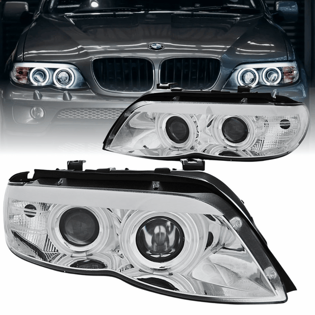 Mit diesen Xenon Scheinwerfern in edler Chrom-Optik erhält Dein BMW X5 E53 (11/2003–2006) ein stilvolles Lichtupgrade. Die Kombination aus Doppelprojektoren, Angel Eyes und glänzendem Chrom-Design sorgt für auffällige Optik und hervorragende Sicht. So wird Dein SUV zum echten Blickfang – sicher und modern zugleich.